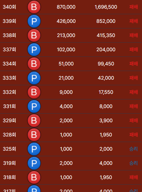 1000 2000 4000 21000 51000102000 213000 426000 870000 마틴하다 디지넌 수가 있데이.. 걍 잔돈베팅이나 해래이 ㄹㅇㅋㅋ