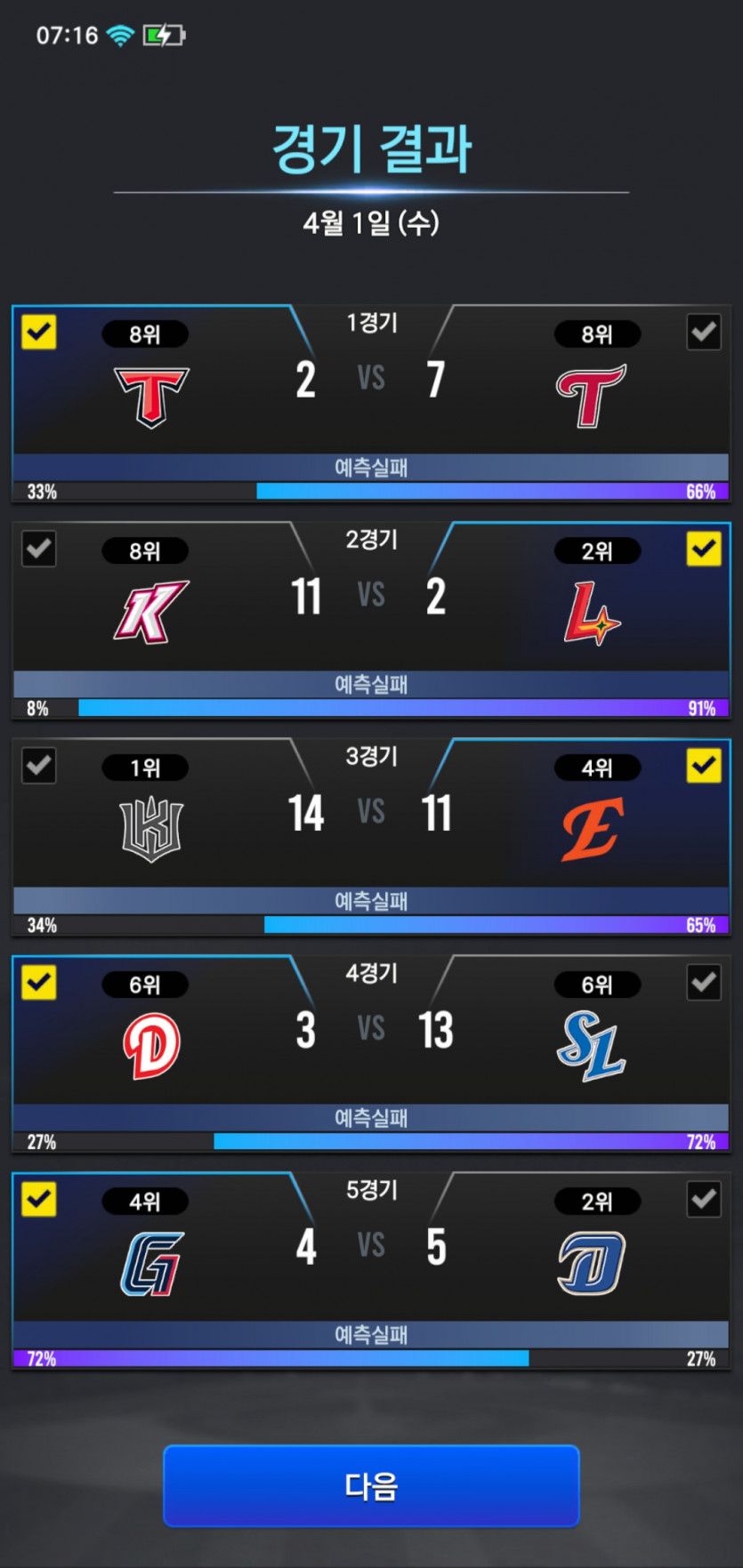 본인 야구게임 kbo 승부예측 결과