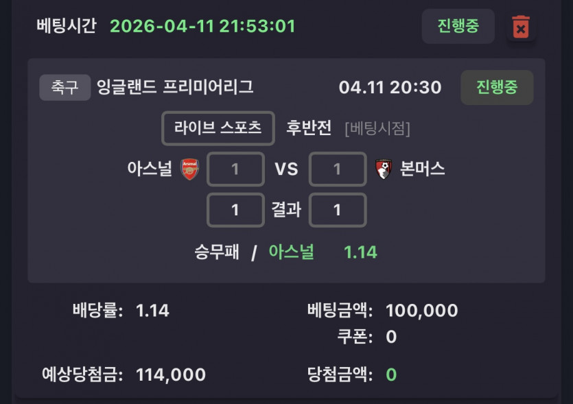 아스날 인플레이 배팅 중 오류인데 킹하성 1 14 2026-04-11 22:11:02 내가 아스날 1:1 일때 2.10 배 승에 배팅 한건데 배팅완료되니 1.14 아스날 옵사 골 넣을 시점 2:1 로 처리가 됨 지금 본머스 역전 하기전에 이거 오류니 취소 해달라니 안해주네 이게 말이되나 ㅋㅋ 누가 아스날 1.14 먹으려고 10 걸었냐고