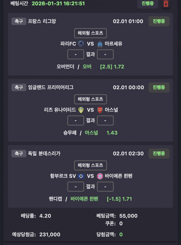 마르세유 2.5옵 아스널 승 바이에른 뮌헨 1.5마핸승 4.2배